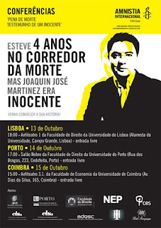 Partindo da experiência de Martínez, a Secção Portuguesa da Amnistia Internacional (AI) organiza o ciclo de conferências "Pena de Morte – Testemunho de um Inocente", que vai passar por Lisboa (dia 13 às 18h no Anfiteatro 1 da Faculdade de Direito da Universidade de Lisboa), Porto (dia 14 às 17h no Salão Nobre da Faculdade de Direito da Universidade do Porto) e Coimbra (dia 15 às 15h no Anfiteatro 3.1 da Faculdade de Economia da Universidade de Coimbra) - todas de entrada livre.