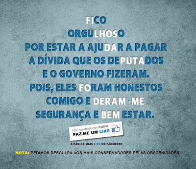 A dívida do País está acima dos 150 mil milhões de euros, o que significa que eu estou endividada em 15 mil euros. Paguei em impostos no ano passado 10 mil euros. Não chega nem para a minha parte da dívida colectiva. E com pessoas como o senhor(a) a esbanjar desta forma o meu dinheiro, os impostos dos contribuintes não vão chegar nunca para pagar o que realmente devem pagar: o bem-estar colectivo.