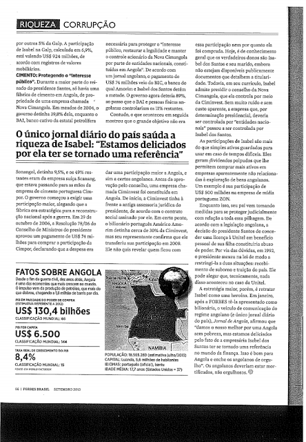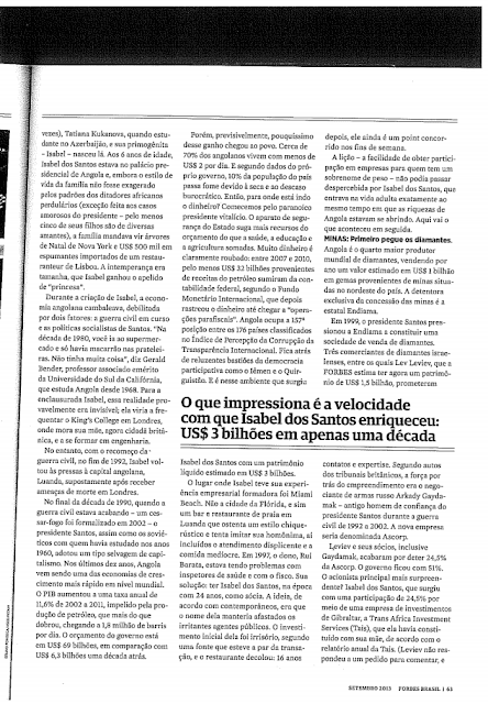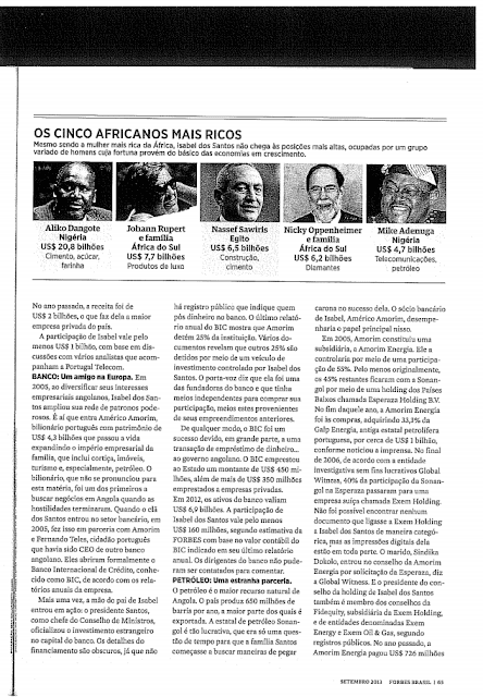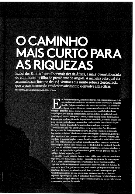 Brasil - O referido título foi avançado pela edição brasileira da revista "Forbes Brasil" que dedica algumas páginas a Isabel dos Santos e ao caminho curto com que a mesma e sua família conseguiram acumular capital em Angola.